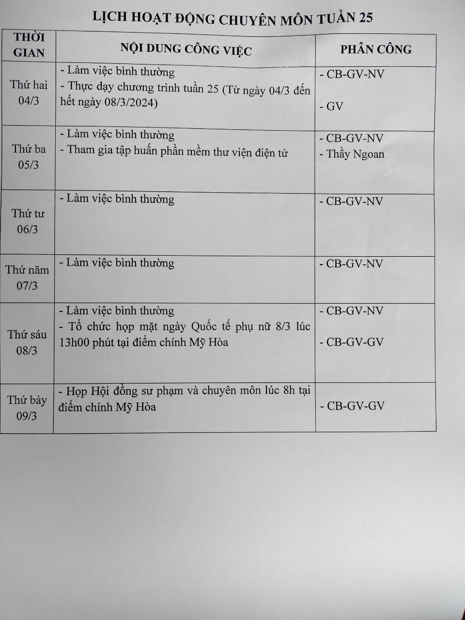 Lịch công tác tuần 25/2024